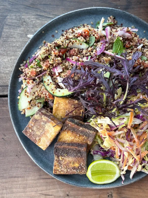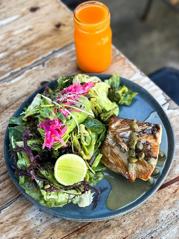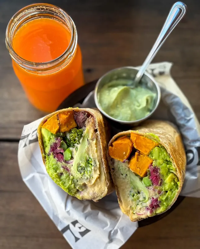 Burrito con base de Camote asado, brocoli, palta, chucrut, y mayo cilantro vegana. PROTEÍNA A ELECCIÓN.